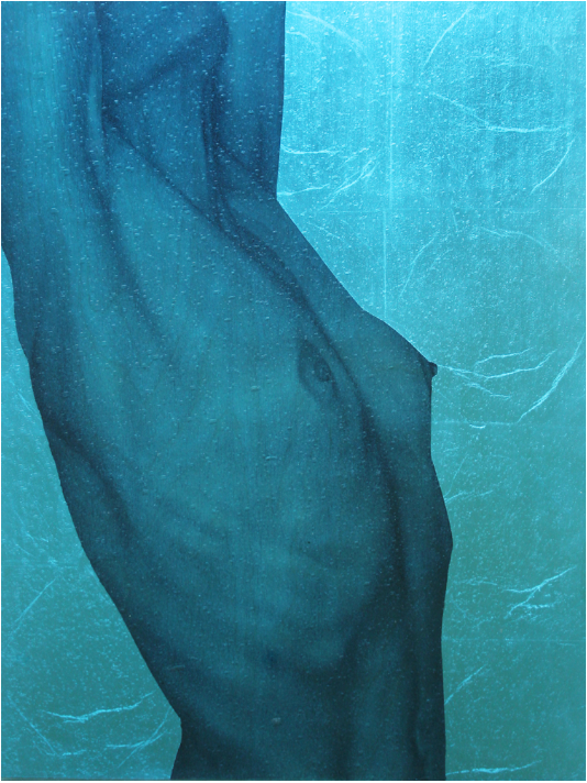 Tanya Fletcher’s current pieces consist of life sized figures rendered in oil with metal leaf backgrounds on Baltic birch. These multiple panel pieces are reductively painted. This results in a brush-free photographic-like realism. The artist’s theatrical use of size & composition imbues these paintings with a taut level of emotional intensity. Curves, creases & bulk speak for themselves without distraction.